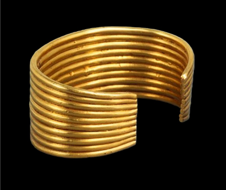 Gilded silver reproduction of one gold tubular bracelet - Au191 - exhumed from an occasional discovery during agricultural work at one big farm (Herdade do Álamo) in the region of Moura (Beja - Alentejo), from the Archaic Jewellery Collection of the National Archaeological Museum (Lisboa). This work was carried out without touching the original artefact through the use of 3D scanning technology, before proceeding with the goldsmith handwork, after the lost wax casting being made.