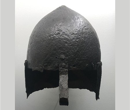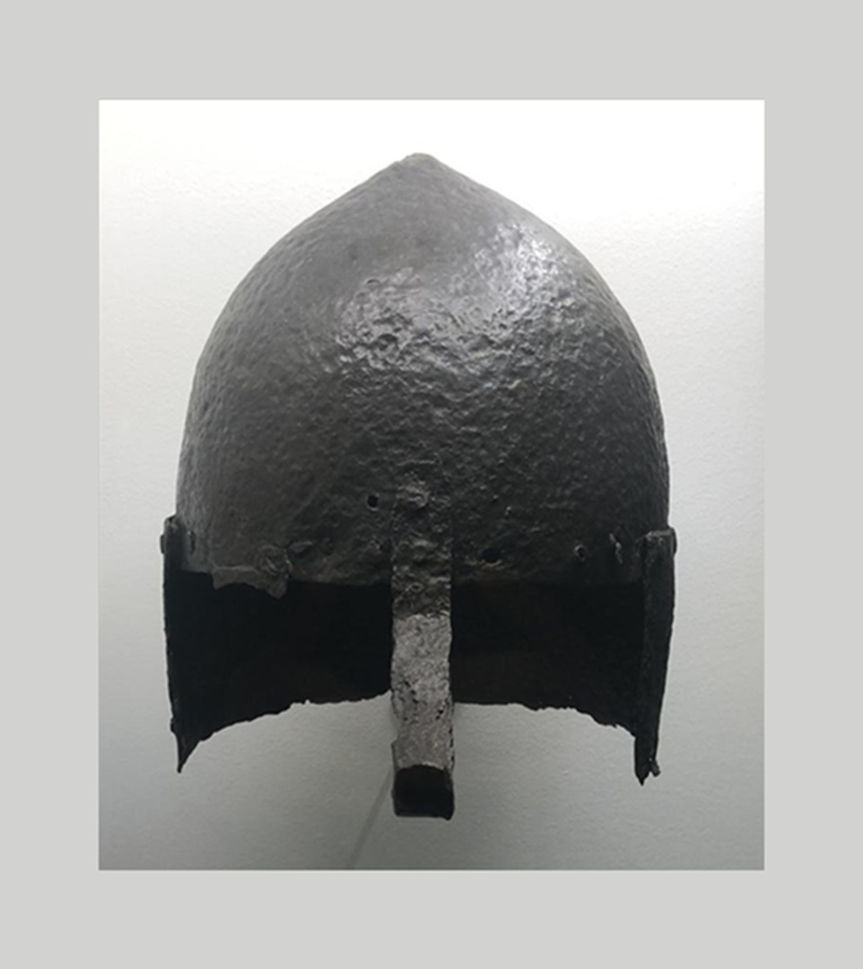 Collage of the shield that was separated from the hull on the left side of one iron alloy helmet, which was collected during archaeological excavations carried out in the vicinity of the Torres Novas Castle. This object belongs to the collection at the Archaeology Centre | Cerca da Vila, integrated into the Carlos Reis Municipal Museum.