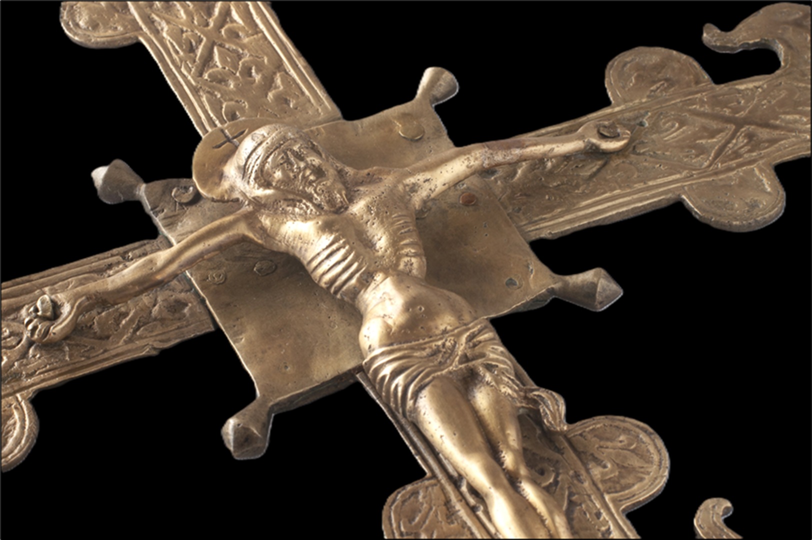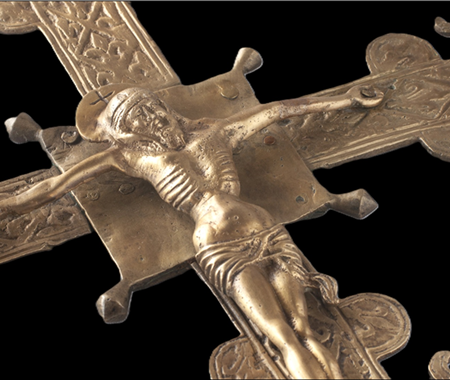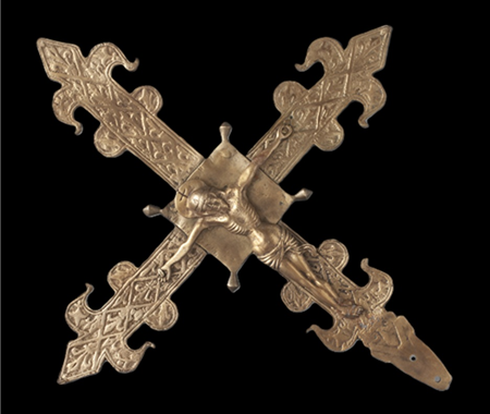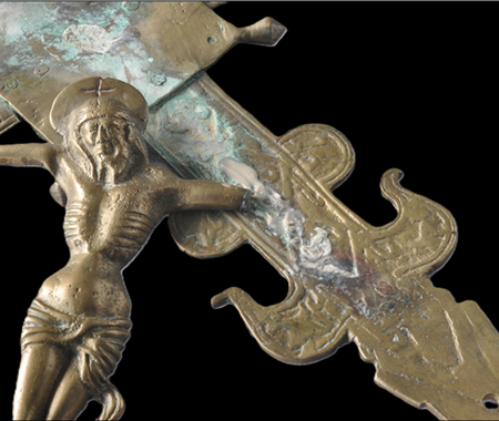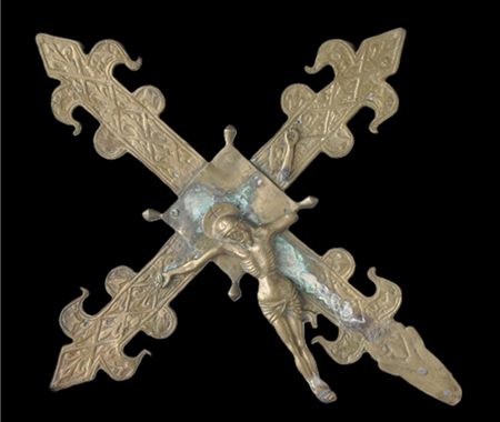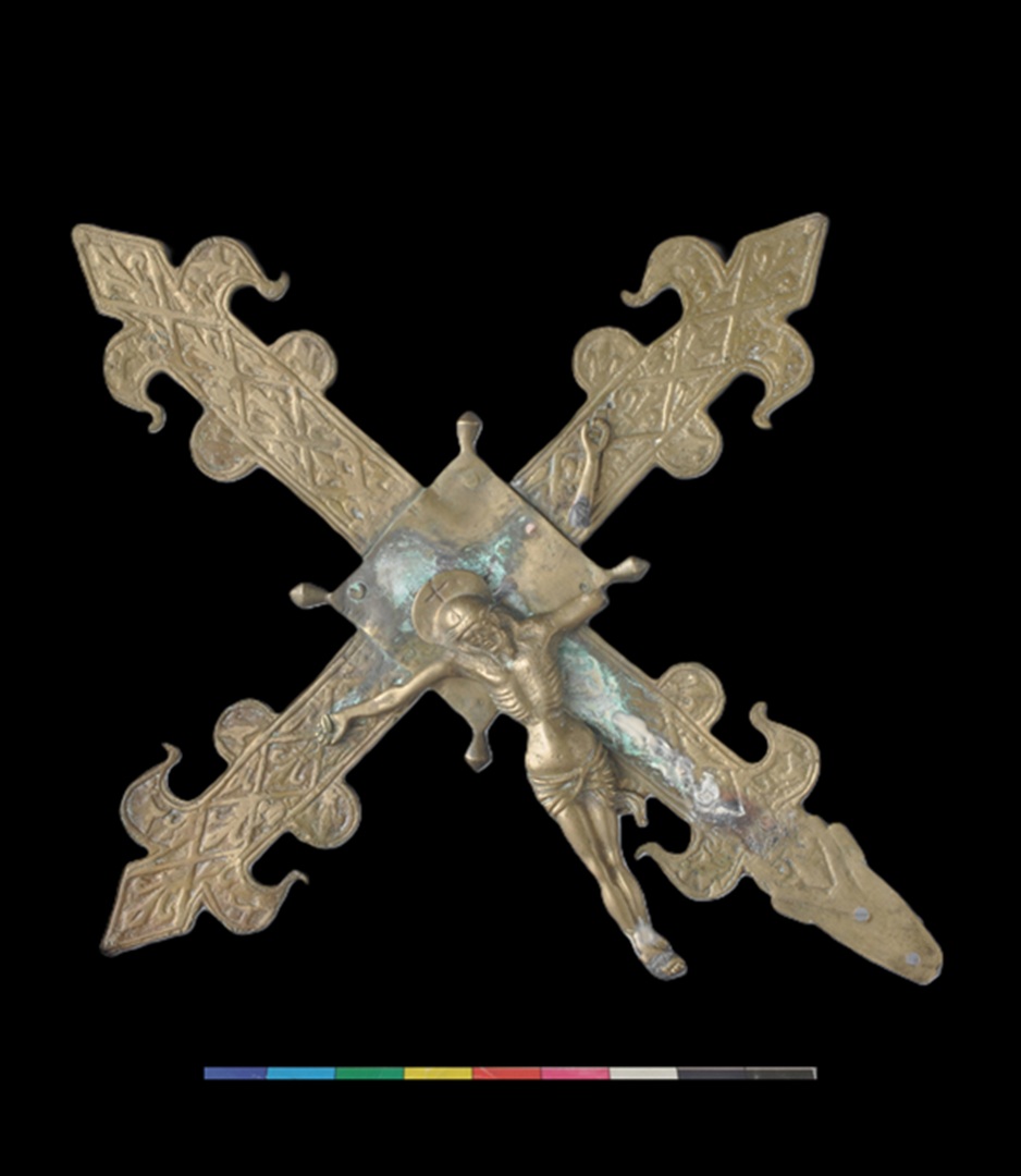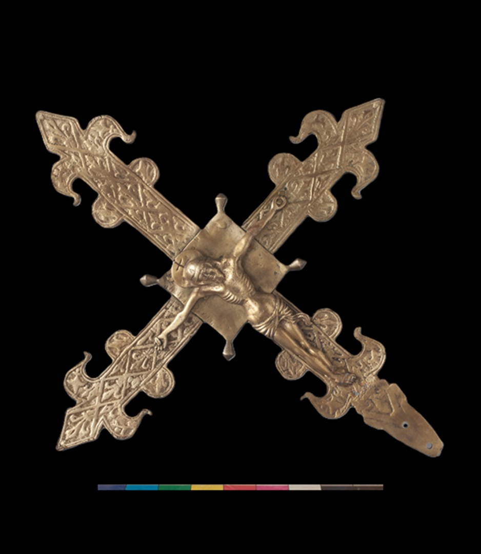 Conservation and restoration of a processional cross made of cast copper alloy (probably brass), with rectilinear arms, rhythmed by two semicircular projections and fleur-de-lis-shaped extremities, decorated with vegetal and geometric motifs, from the collection of the Municipal Museum of Penamacor.
