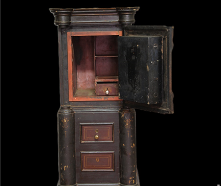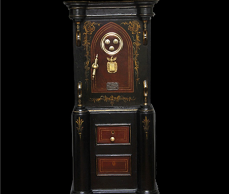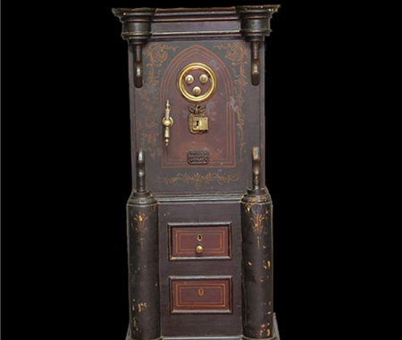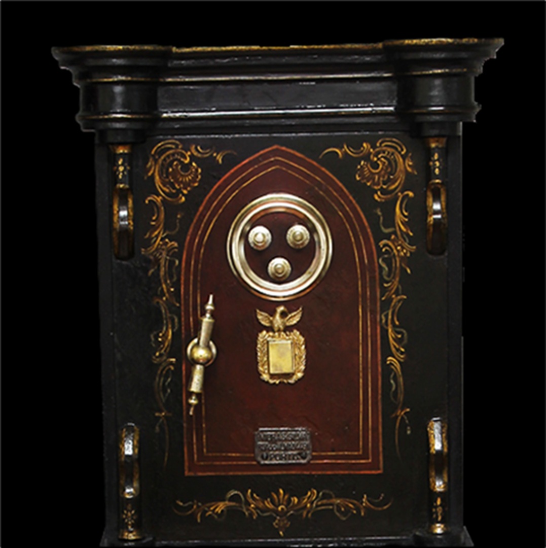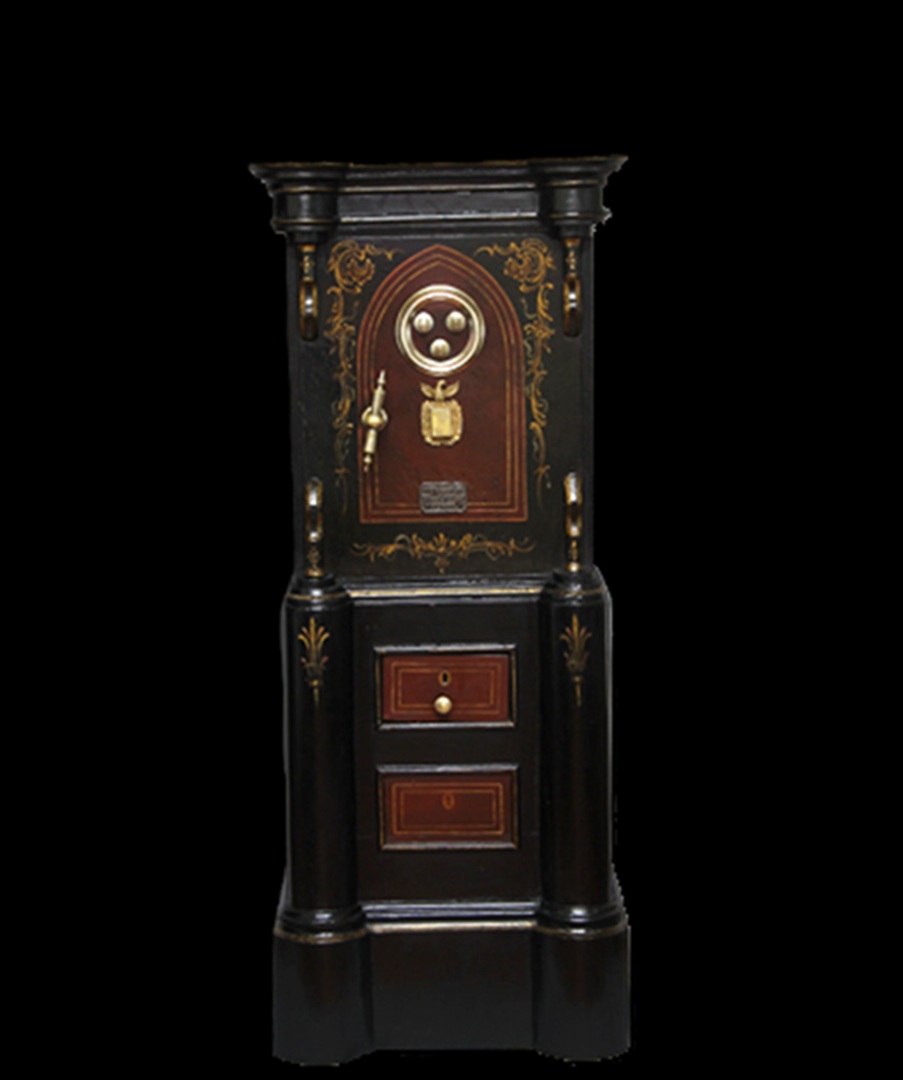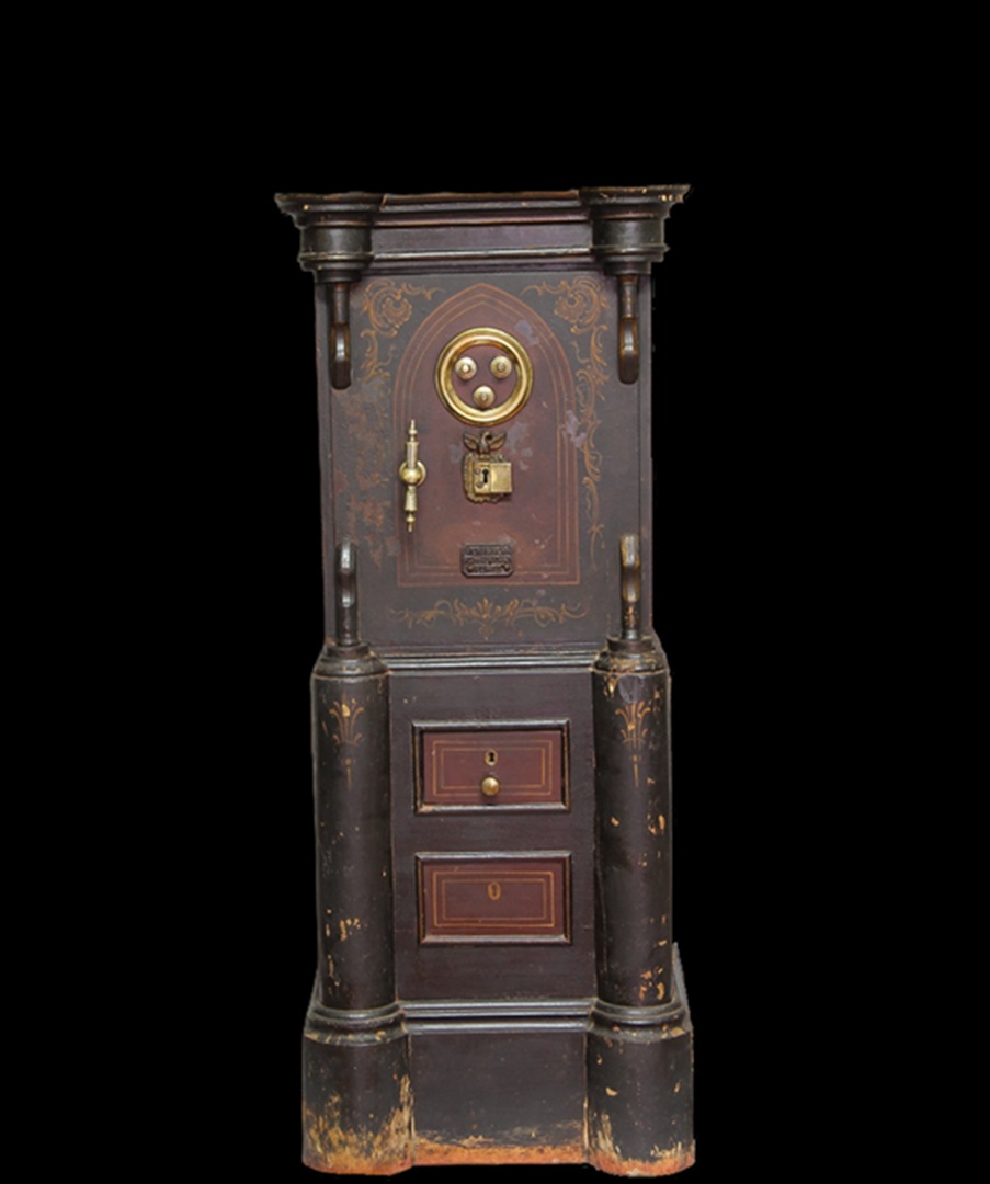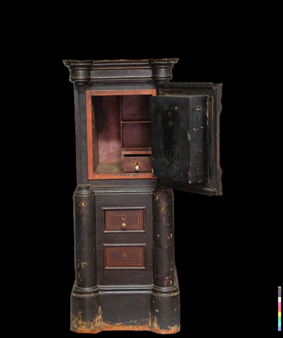 Conservation and restoration of a safe with polychrome outside, identified with the brand "Vieira e Silva", consists of a wooden base with two drawers, a centre made of iron and copper alloys and a wooden top. This safe-deposit box was made in a workshop located in Rua do Almada, nº 461, in the city of Porto.