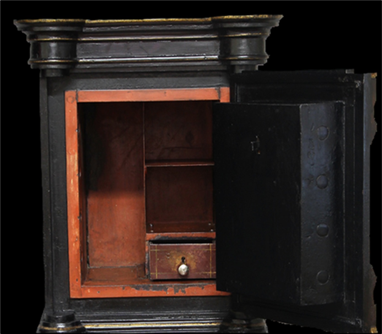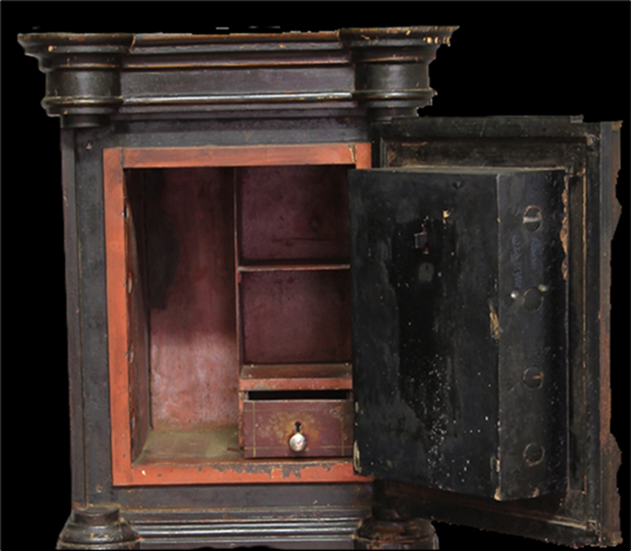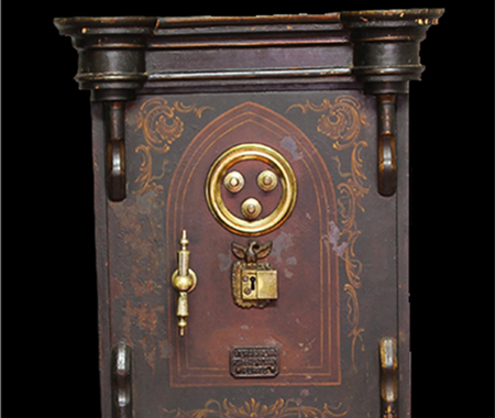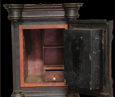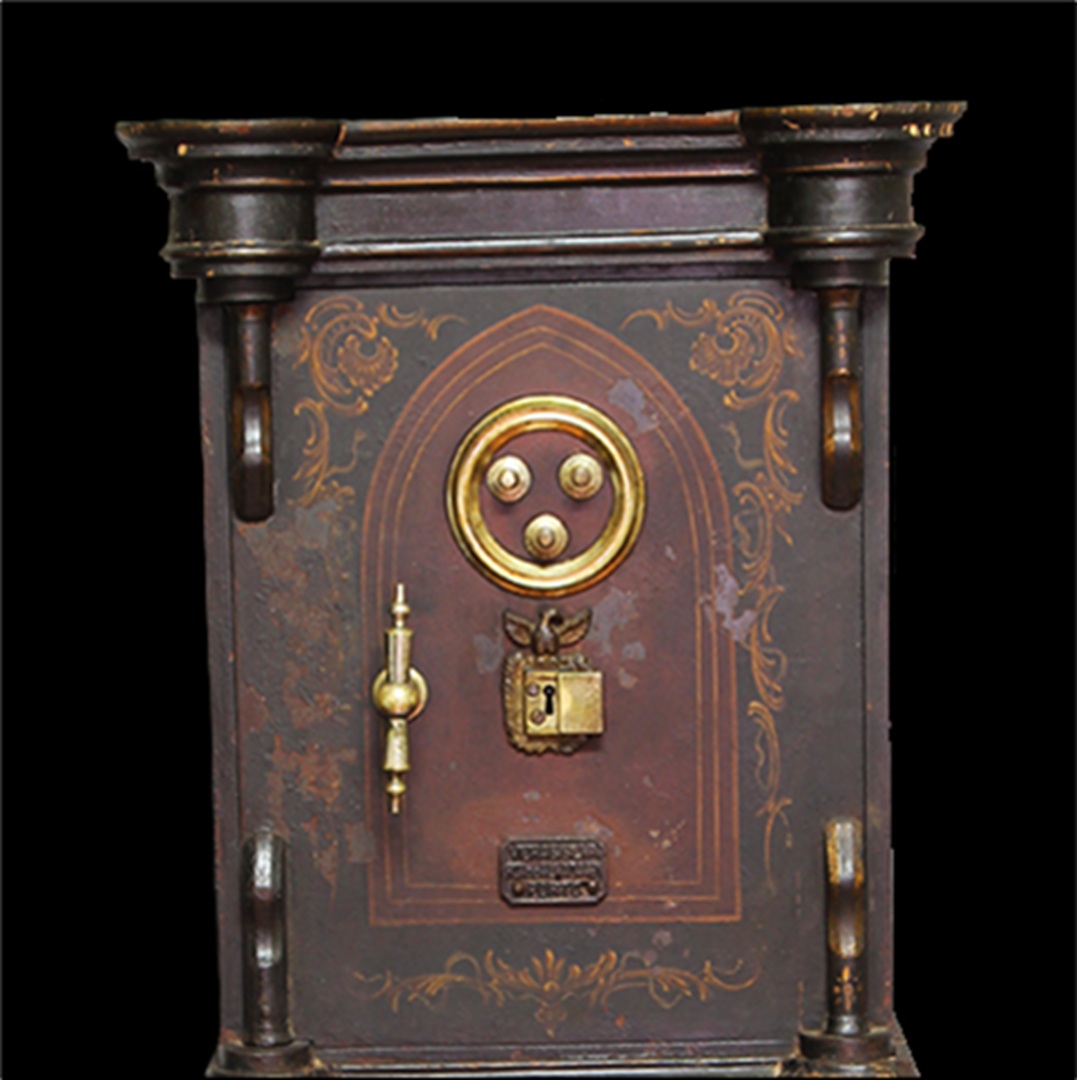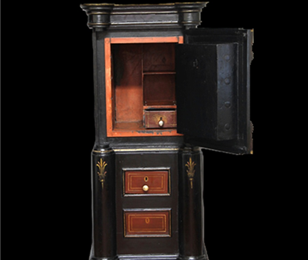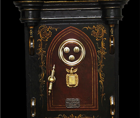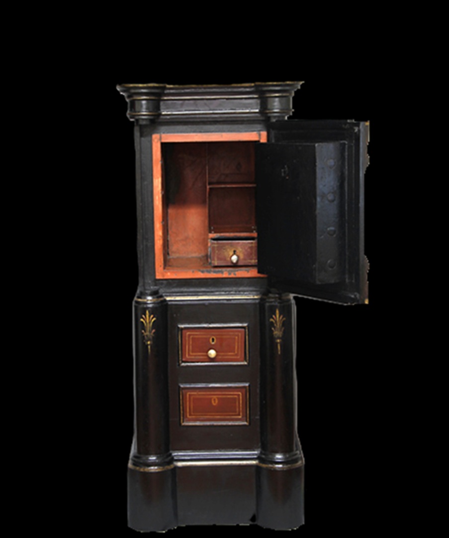 Conservation and restoration of a safe with polychrome outside, identified with the brand "Vieira e Silva", consists of a wooden base with two drawers, a centre made of iron and copper alloys and a wooden top. This safe-deposit box was made in a workshop located in Rua do Almada, nº 461, in the city of Porto.
