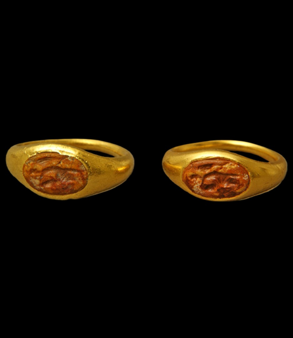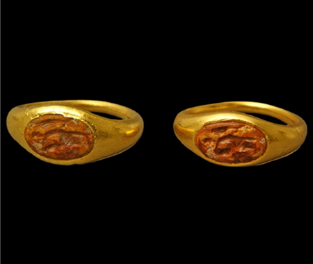 Original gold signet ring (Au 130).Gilded silver replica, from a gold signet ring (Au 130).Signet ring, gold original (Au 130) and silver gilded replica.Museum of the Municipal Community of Batalha