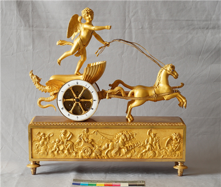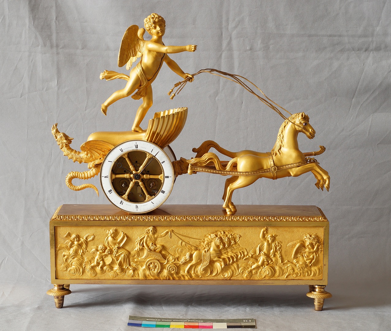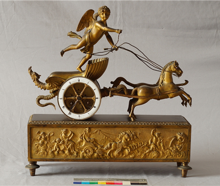 Table clock Au char de L'Amour, gilded copper with patina, copper, iron alloys and enamel (PNQ 1343);