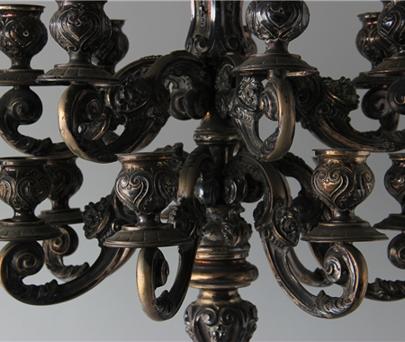 Chandelier base, before the intervention.Chandelier base, after the intervention.Chandelier detail, before the intervention.Chandelier detail, after the intervention.Two chandeliers, before the intervention.Two chandeliers, after the intervention.