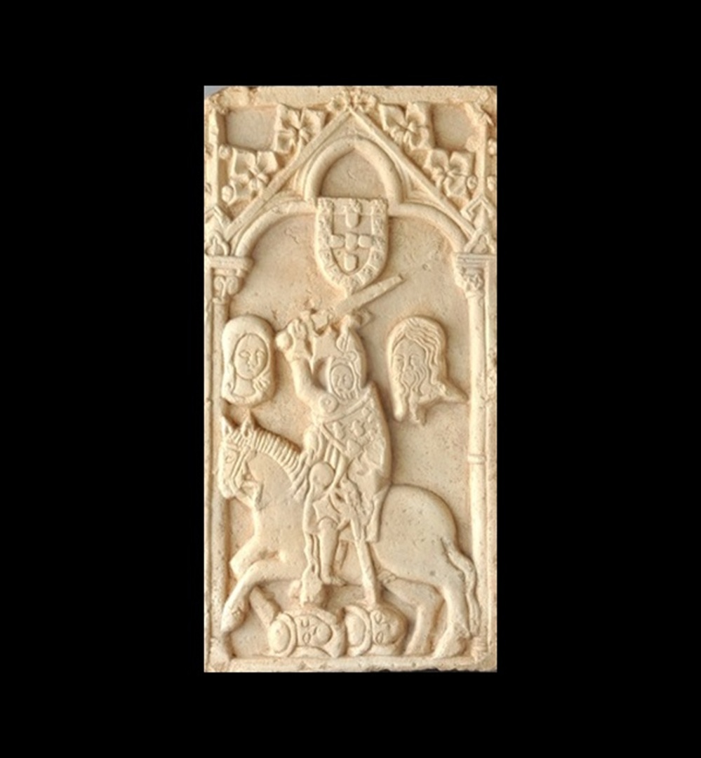 Original do Brasão de Armas da Cidade de Évora feito de mármore - detalhe Réplica do Brasão de Armas da Cidade de Évora feita de resina - detalhe Original de mármore do Brasão de Armas da Cidade de Évora em exposição. Réplica do Brasão de Armas da Cidade de Évora feita em resina.