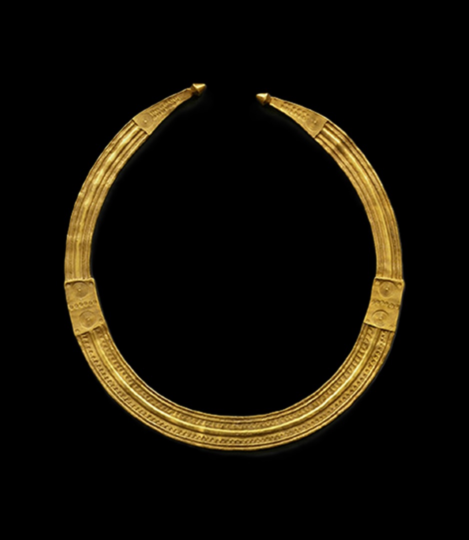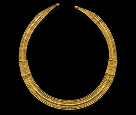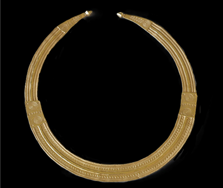 Lúnula de ouro original (Au294). Lúnula de prata dourada, réplica de lúnula de ouro. Colar de ouro original (Au295). Colar de prata dourada, réplica de colar de ouro.Réplicas do colar e da lúnula, depois da fundição e antes do acabamento. Réplicas do colar e da lúnula feitas em prata dourada. Réplicas de prata dourada acondicionadas para transporte. Exposição "Os ícones de Viseu"