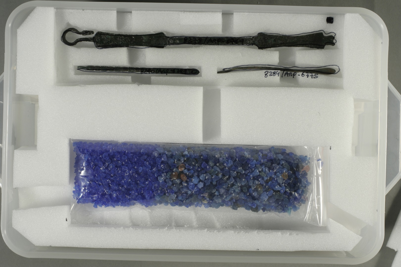 Packaging of copper ally artefacts (27), except one weight and one bird, exhumed from archaeological sites in the region of Santiago do Cacém (Alentejo):