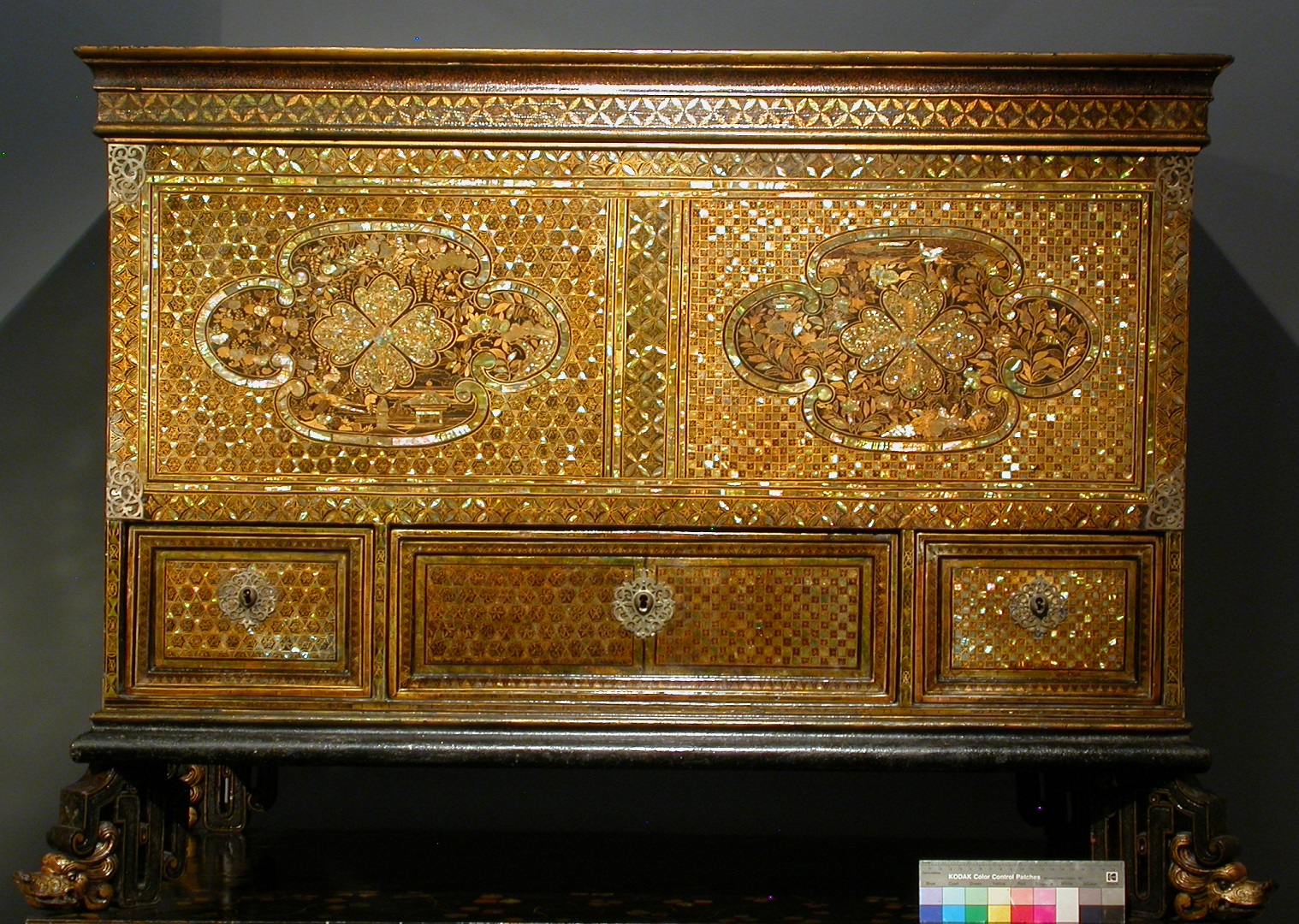 - Parallelepiped shape chest made of lacquered wood, with a removable smooth top, front and side bands filled with mother-of-pearl inlays, with copper alloy hardware and covered with a layer of shellac, sitting on a wooden table (1875).