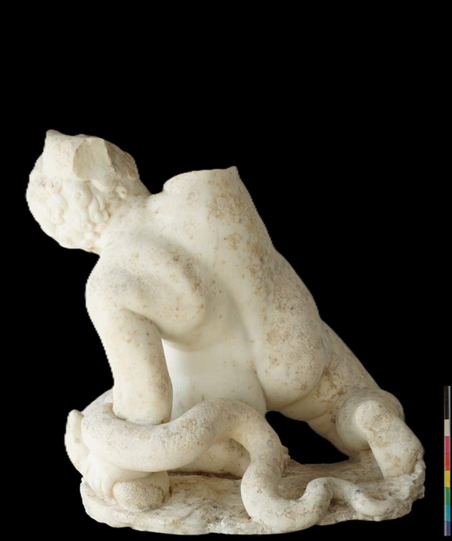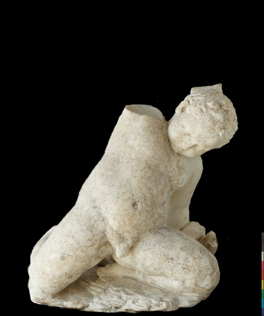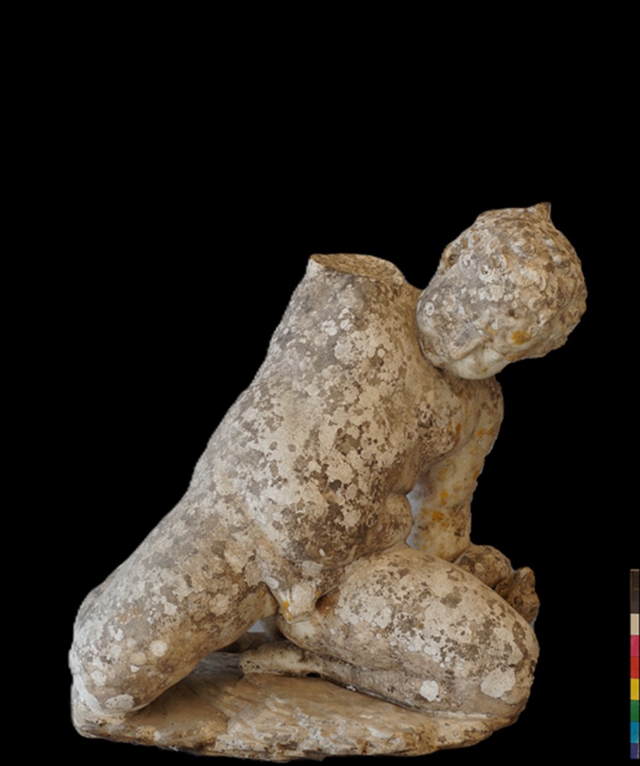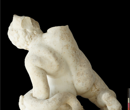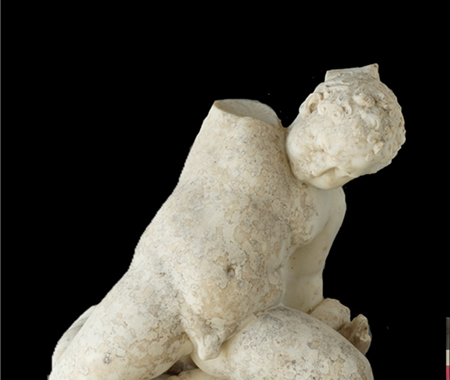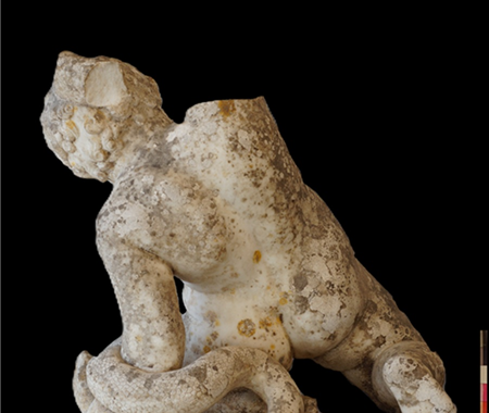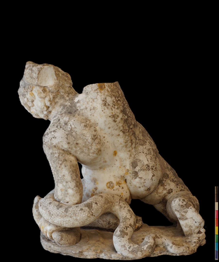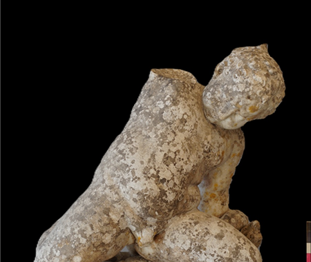 Conservation and restoration of a carrara marble sculpture, a figure of form, with classic treatment, to attach to a plinth and to put in a romantic garden, in this case in the Park of the Palace of Monserrate*; represents Hercules* in boy in a genuflect position, with the body in twist, and a serpent at his feet and curled in his left arm. Work done by António Morgado, stone conservator technician.