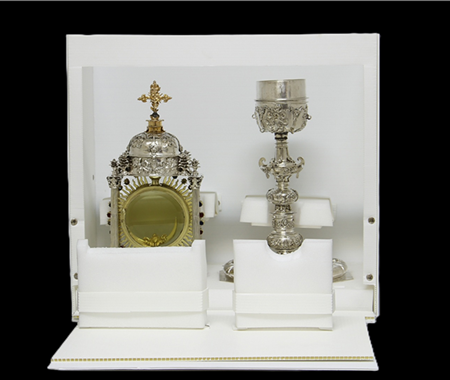 Execution of one ribbed polypropylene box with interior polyurethane foam for packaging and transportation one monstrance (DGASAp. esc.15) made of silver alloy, glass and gems, done by Franciscvs Llanus, 1716 from the Sacred Art Collection of Diocese of Guarda.