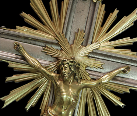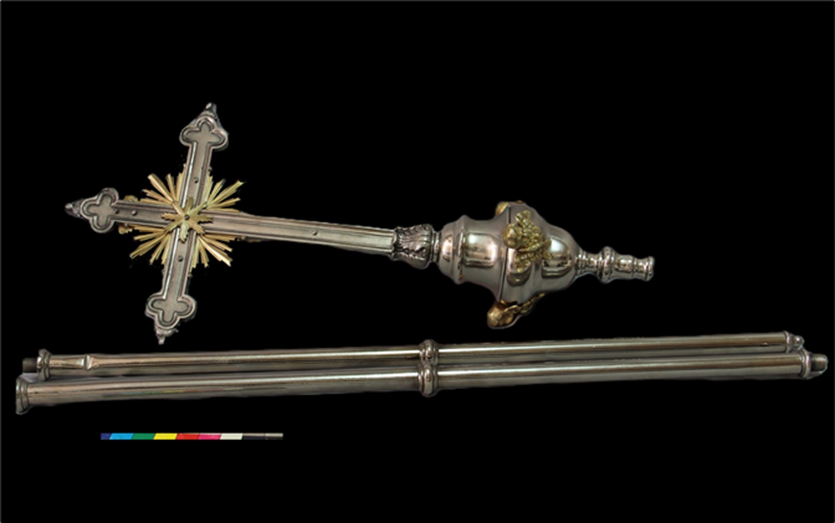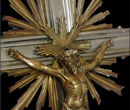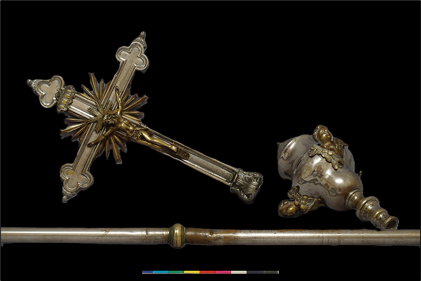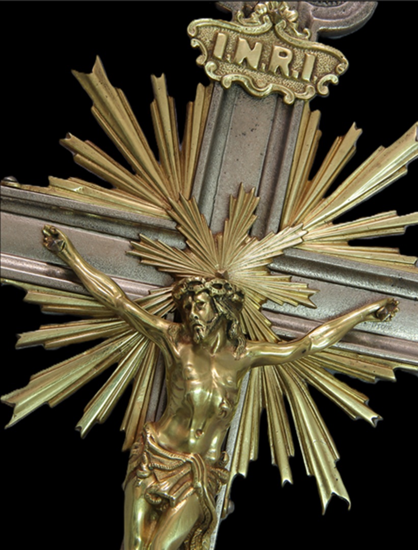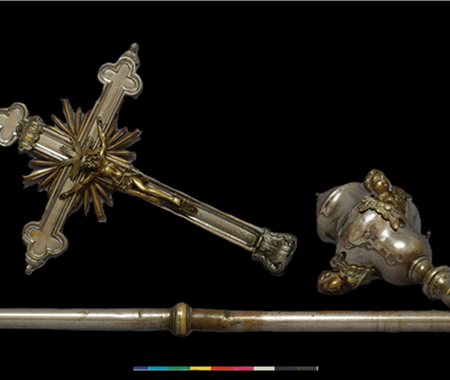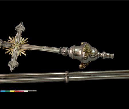 Conservation and restoration of one processional cross made of copper alloy, nickel plated copper alloy and iron alloy.