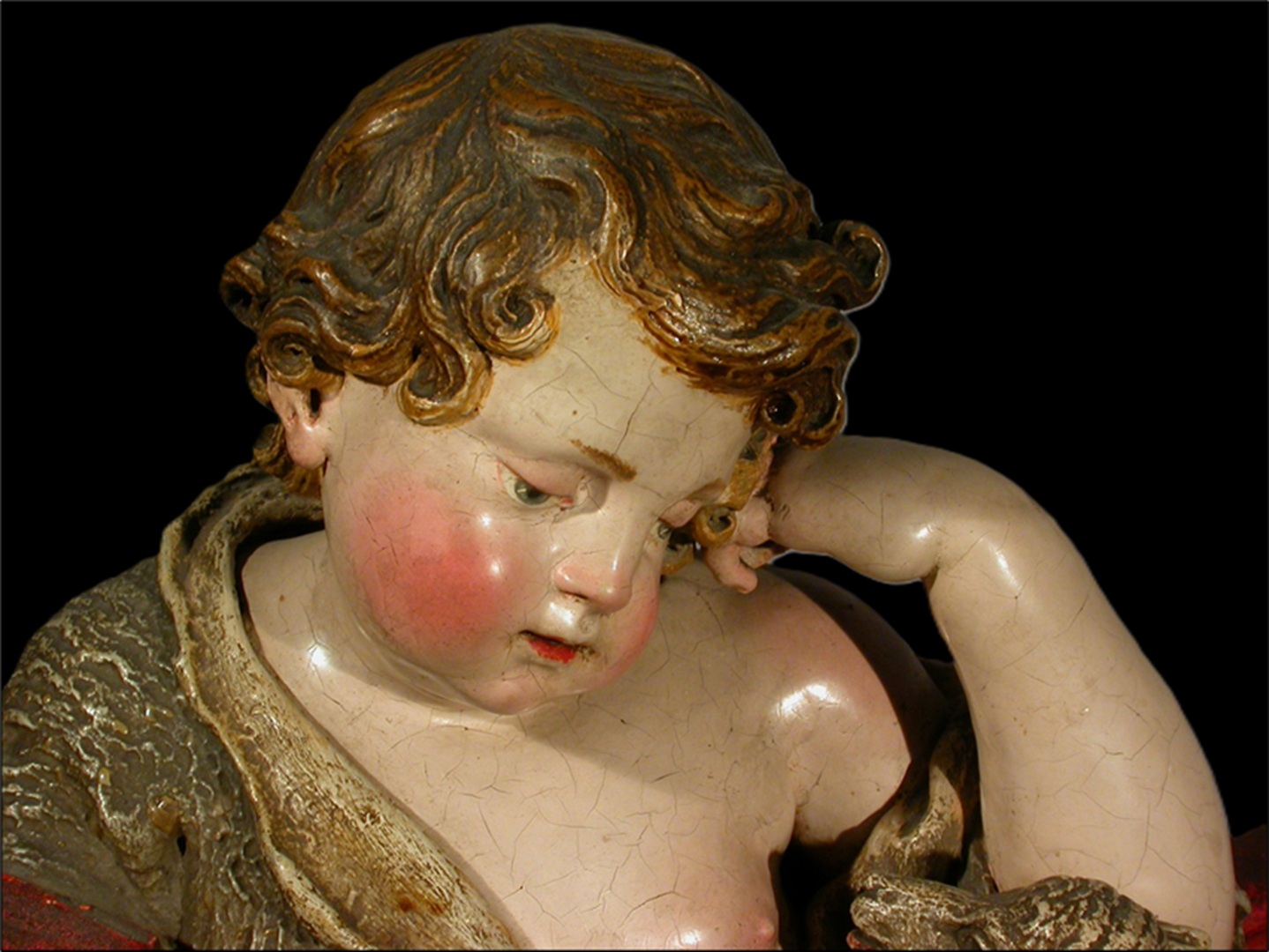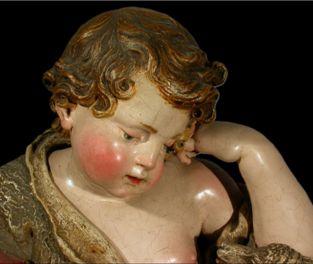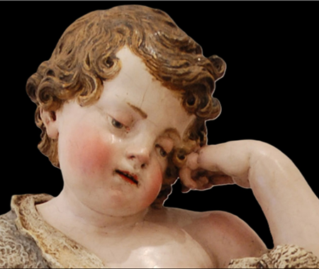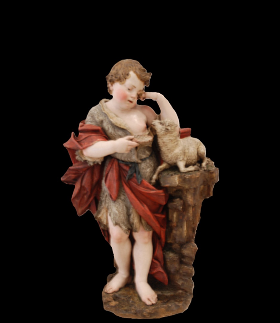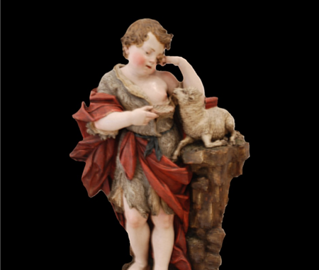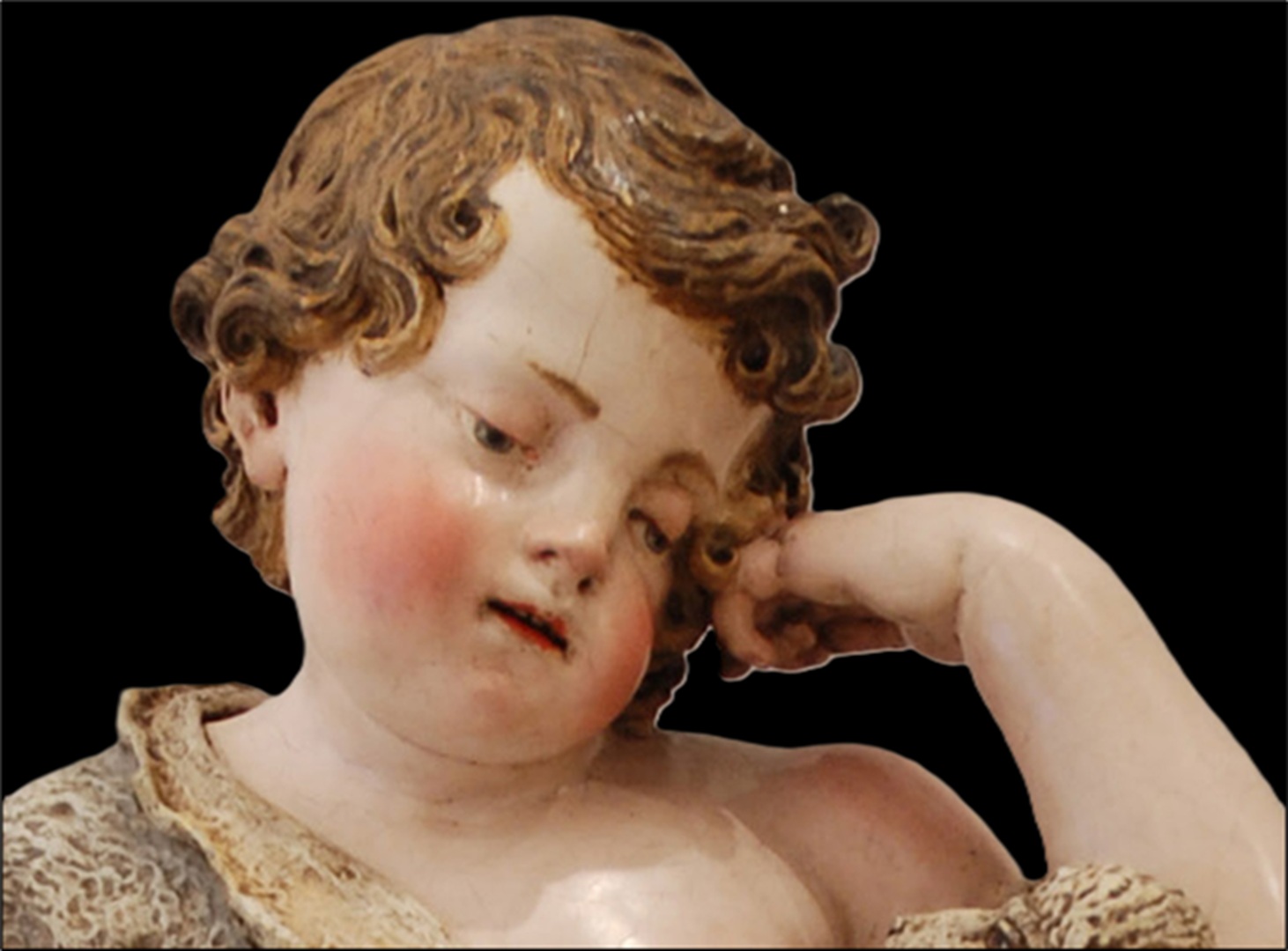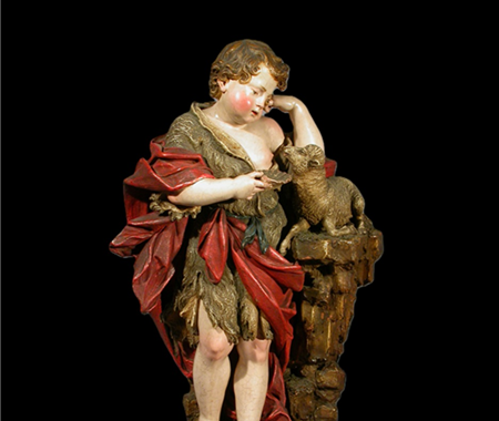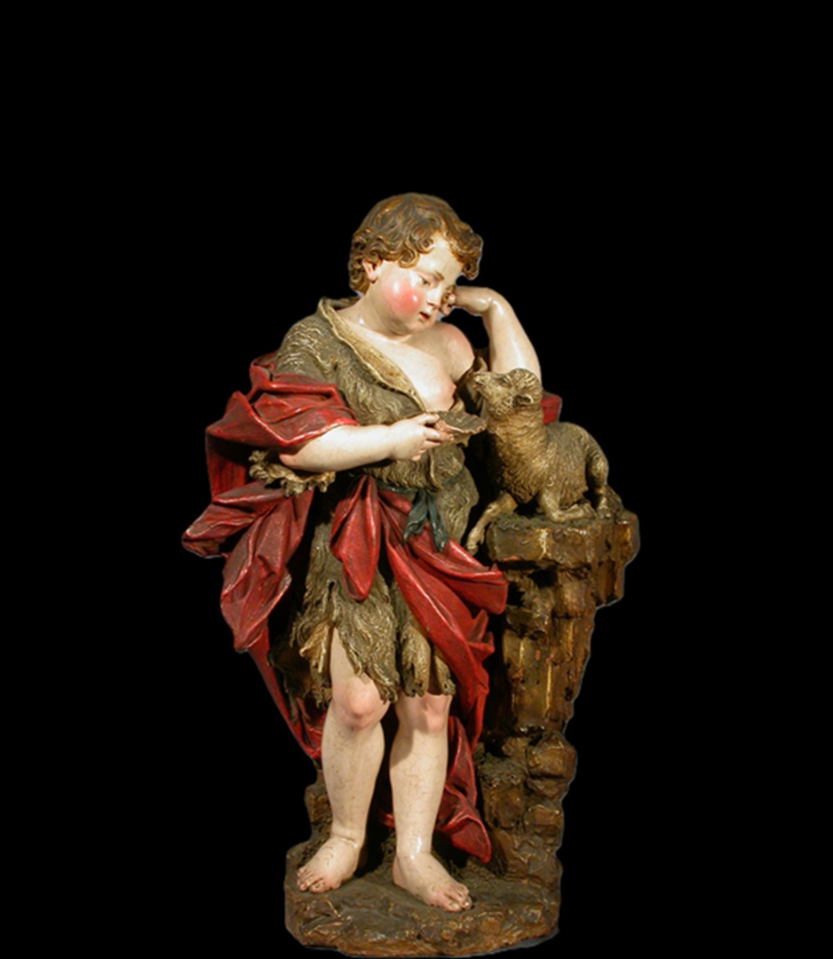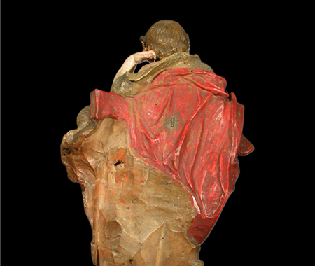 Conservation and restoration of a polychrome terracotta sculpture with a representation of Saint John the Baptist, possibly done by António Ferreira's workshop. The saint is represented with his attributes, the baptismal shell in his right hand and his head reclining on his left hand while observing the lamb, lying on the trunk.