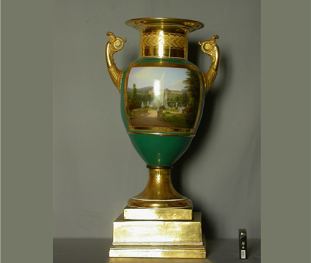 Conservation and restoration of two polychrome porcelain vases with gilded bronze elements and views of German palaces painted by Carl Daniel Freydanck* (1811-1887). The vases were produced by the Royal Manufacture of Berlin (KPM), from the Ceramics Collection of the Museum of the National Palace of Ajuda (Invs. 6165 and 6166).