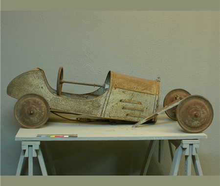 Conservação e restauro de um carrinho a pedais feito de liga de ferro, madeira e de um aglomerado de borracha, do acervo de uma colecção particular.