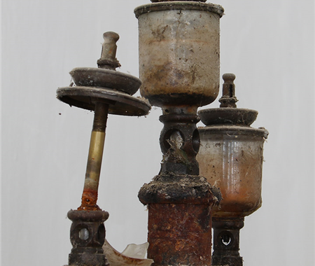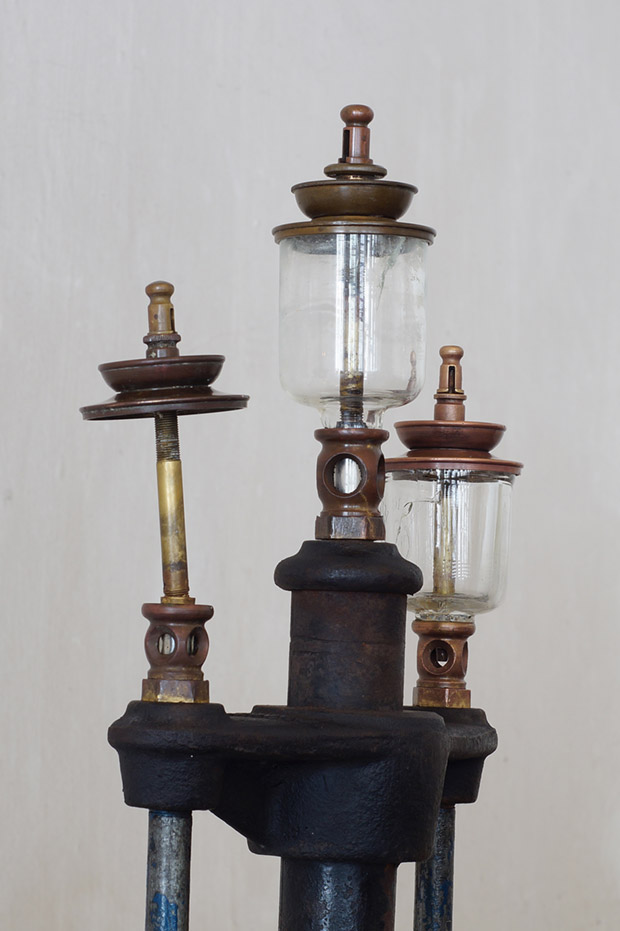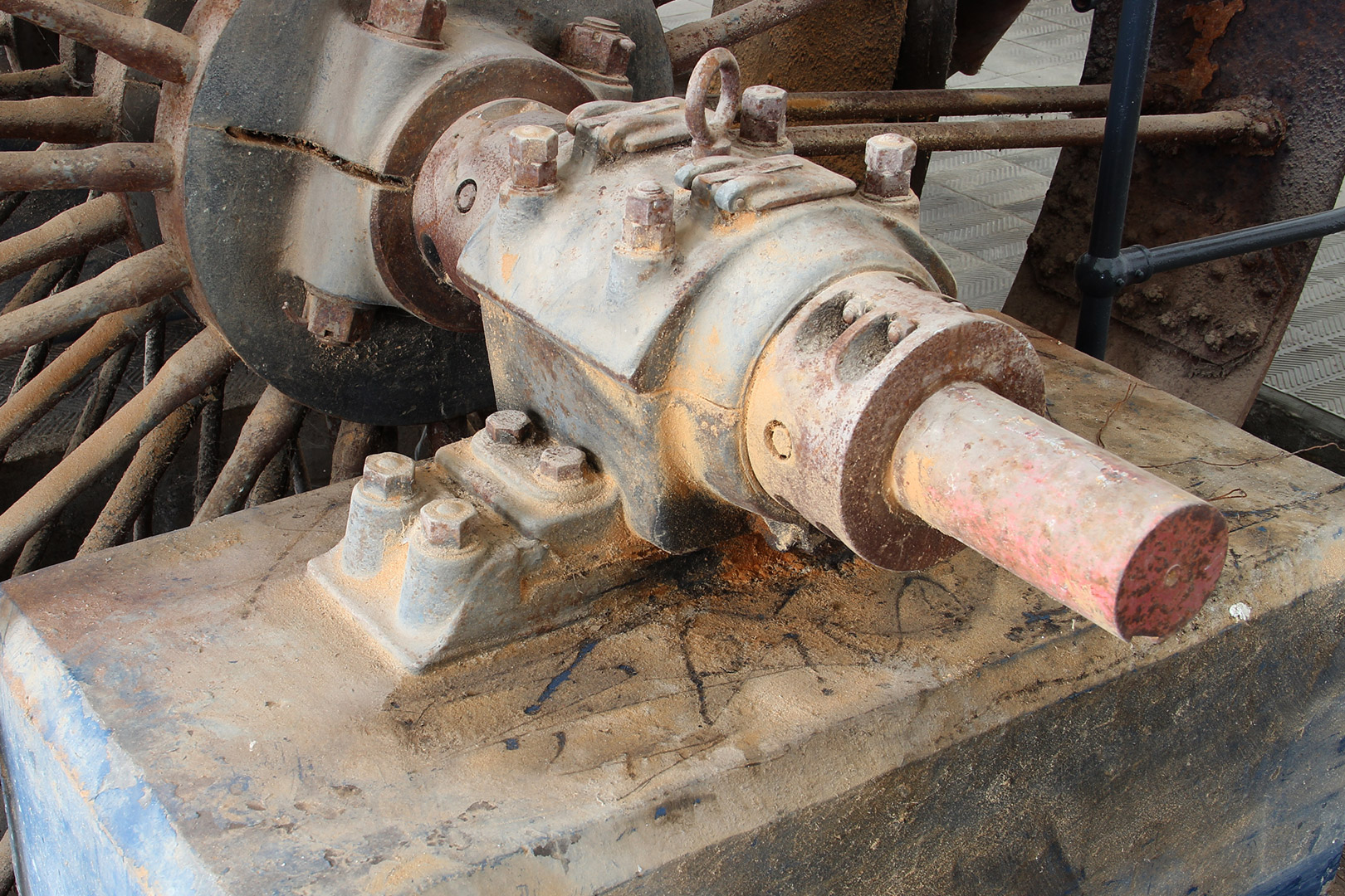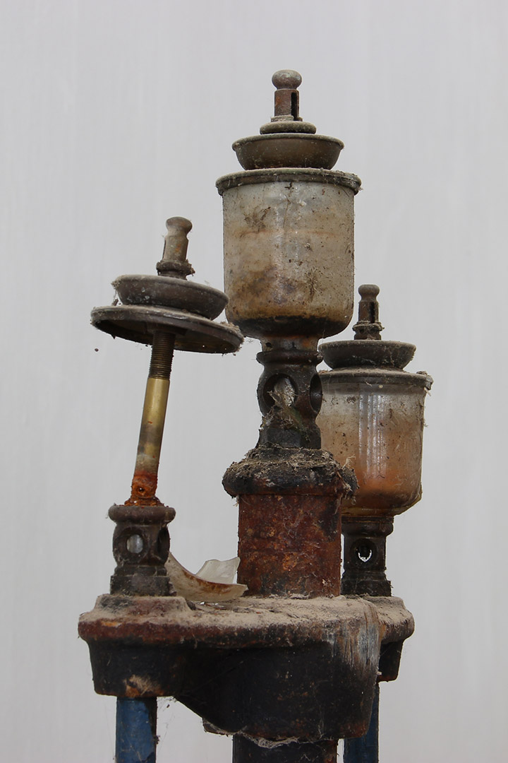 - Equipamento da bomba de água (em falta) dem liga de ferro e base de cimento pintadas.