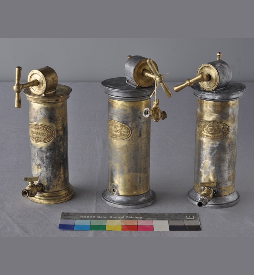 Irrigadores Dr. Eguisier de estanho, antes da intervenção.Irrigadores Dr. Eguisier de estanho, depois da intervenção.Irrigador Dr. Eguisier de porcelana e estanho, antes da intervenção.Irrigador Dr. Eguisier de porcelana e estanho, depois da intervenção. Detalhe da máscara de Ombrédanne, antes da intervenção.Detalhe da máscara de Ombrédanne, depois da intervenção.Máscara de Ombrédanne, antes da intervenção.Máscara de Ombrédanne, depois da intervenção.Escarradores de bolso, antes da intervenção.Escarradores de bolso, depois da intervenção.Bacia de barbeiro-cirurgião, antes da intervenção.Bacia de barbeiro-cirurgião, depois da intervenção.