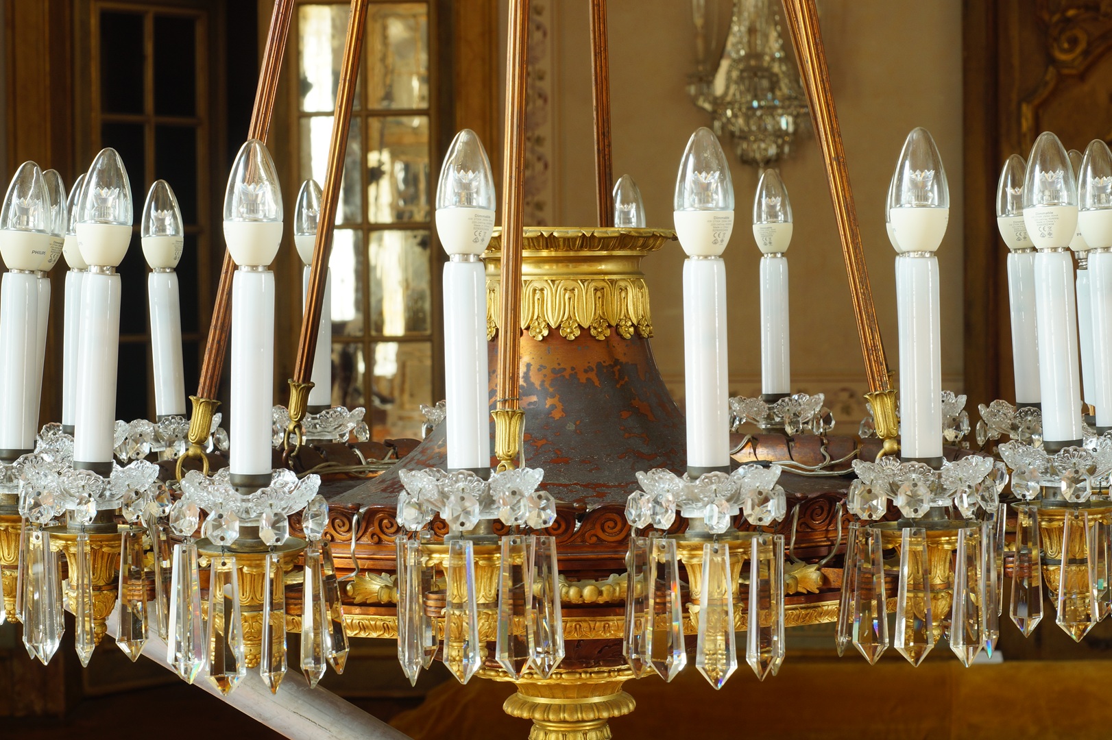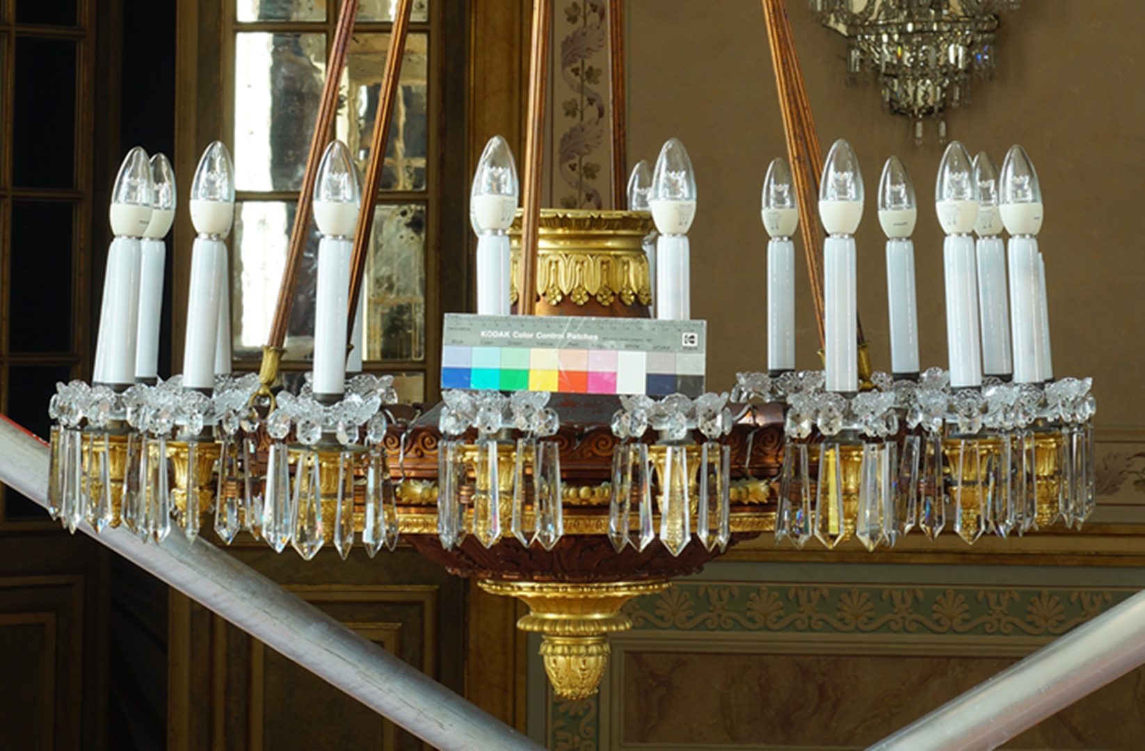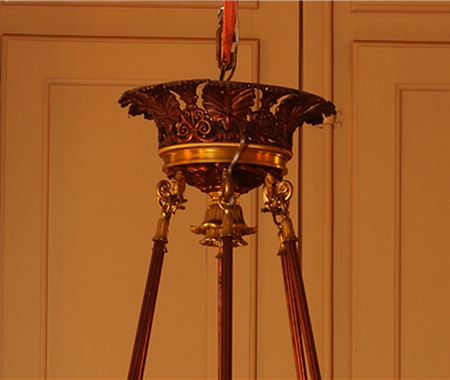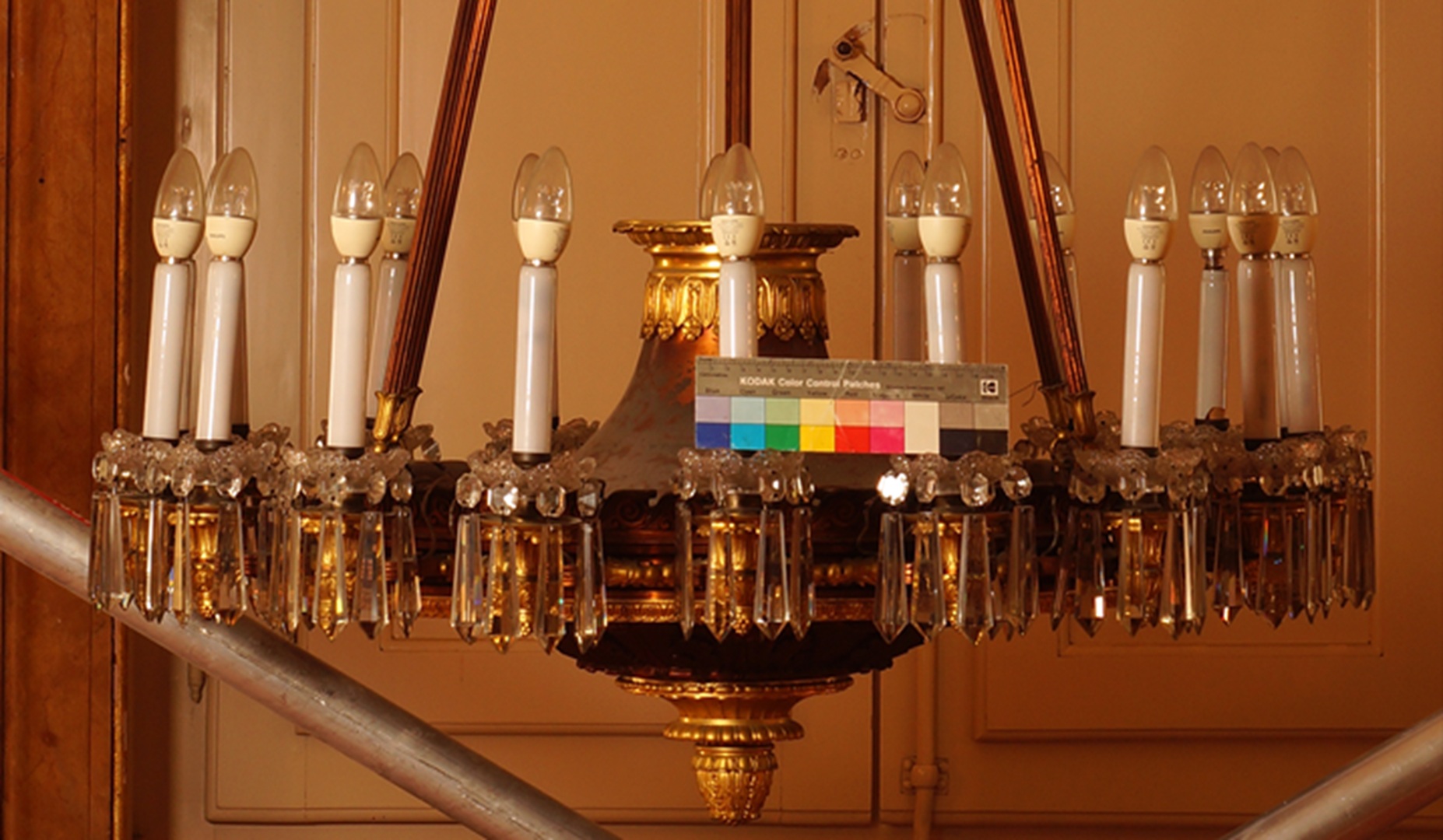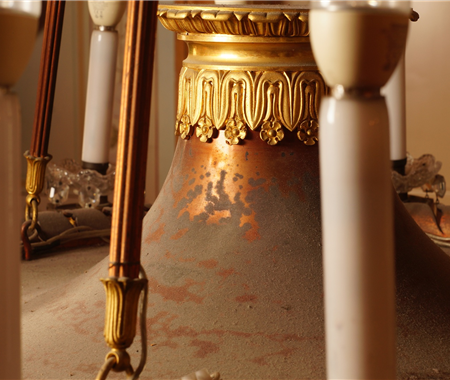 Conservação e restauro de um lustre de liga de cobre, liga de cobre dourada, verniz, cristal (ou vidro), PVC e plástico, do acervo do Palácio Nacional de Queluz (Sintra