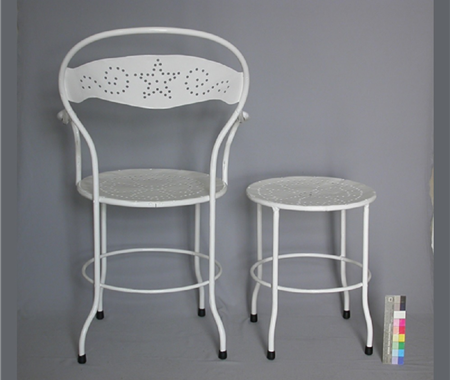 Cadeira e banco de liga de ferro pintada.