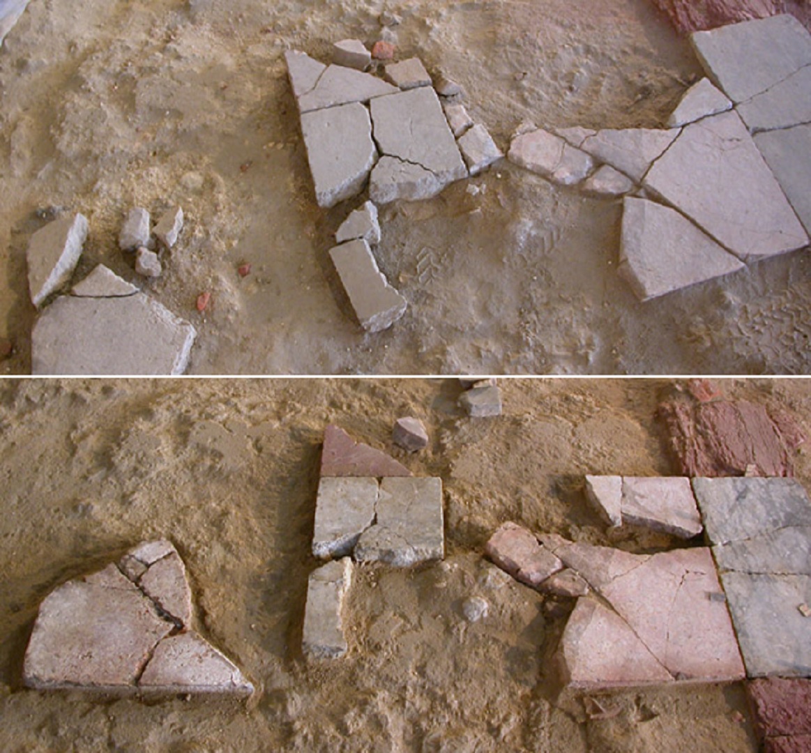 Esquema decorativo do pavimento da orchaestra do Teatro Romano.Esquema decorativo das lajes ainda existentes do pavimento da orchaestra do Teatro Romano. Lajes do pavimento da orchaestra, antes e depois da intervenção. Lajes do pavimento da orchaestra, antes e depois da intervenção.
