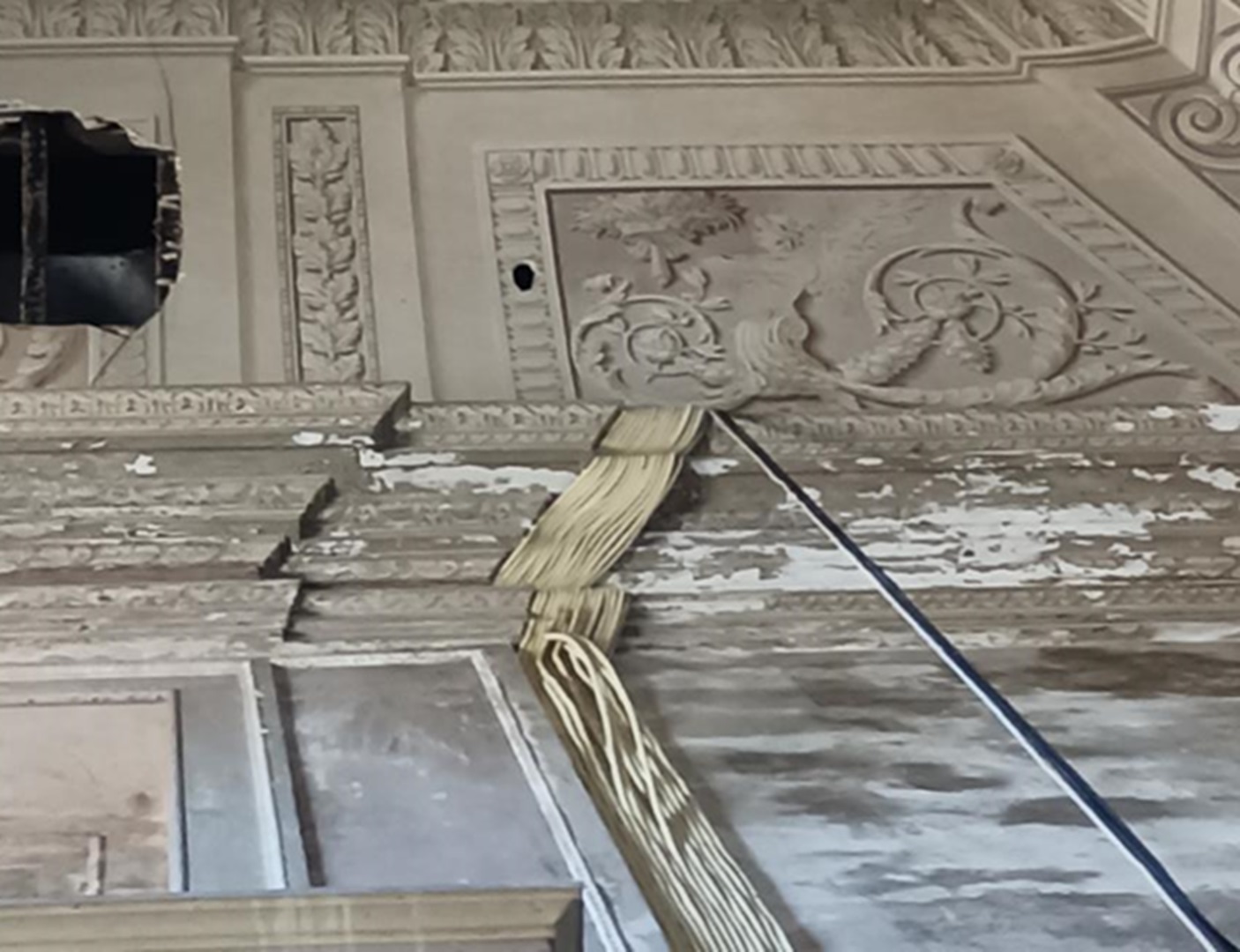 Pormenor da pintura mural no tecto.Danos relacionados com cablagens eléctricas e outras infraestruturas.Imagem geral da pintura mural no tecto.Elemento de madeira (barrote) sem função inserido na parede.Imagem da pintura mural no tecto.Imagem do tecto e das paredes de uma sala.Vista geral de uma sala. Archeofactu